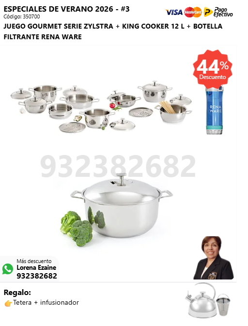 JUEGO GOURMET SERIE ZYLSTRA + KING COOKER 12 L + BOTELLA FILTRANTE RENA WARE + (🎁: Tetera + infusionador )