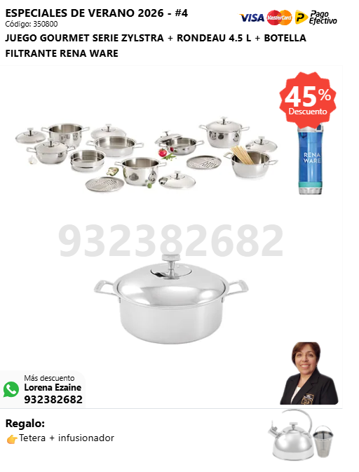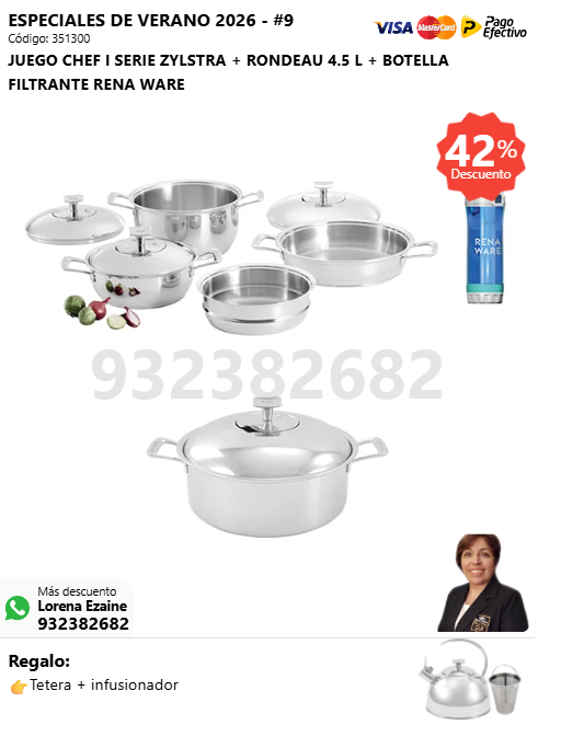 JUEGO CHEF I SERIE ZYLSTRA + RONDEAU 4.5 L + BOTELLA FILTRANTE RENA WARE + (🎁: Tetera + infusionador )