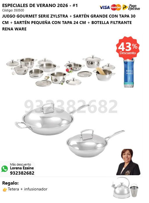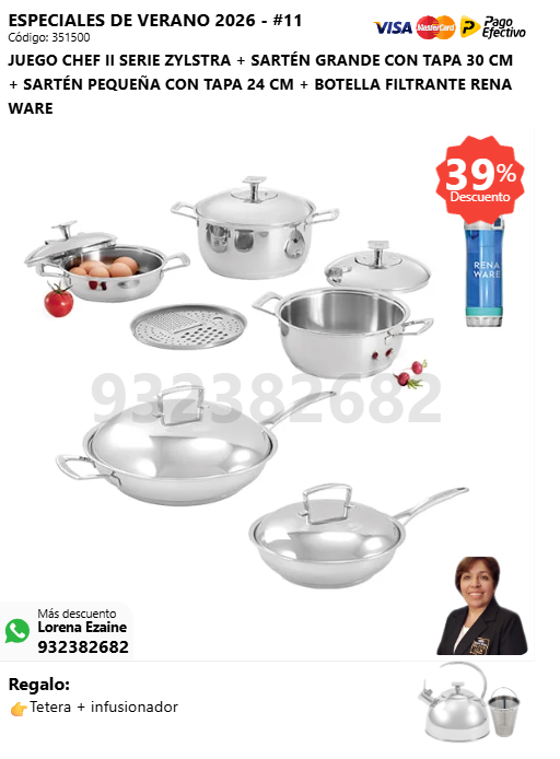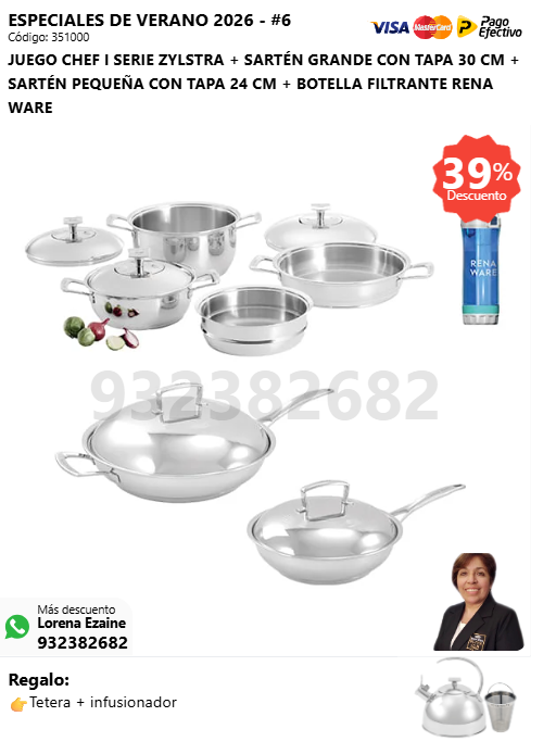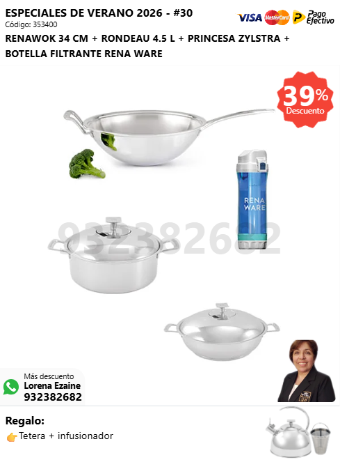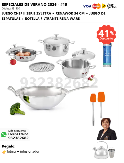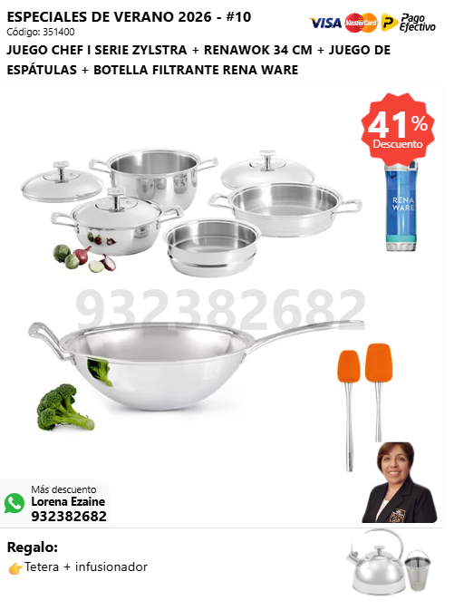 JUEGO CHEF I SERIE ZYLSTRA + RENAWOK 34 CM + JUEGO DE ESPÁTULAS + BOTELLA FILTRANTE RENA WARE + (🎁: Tetera + infusionador )