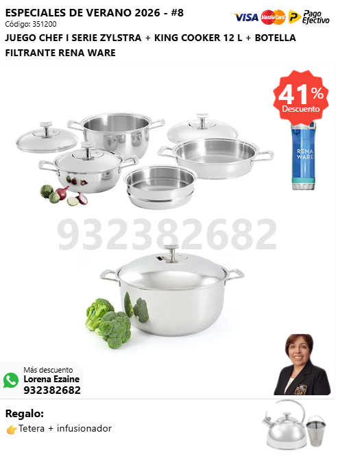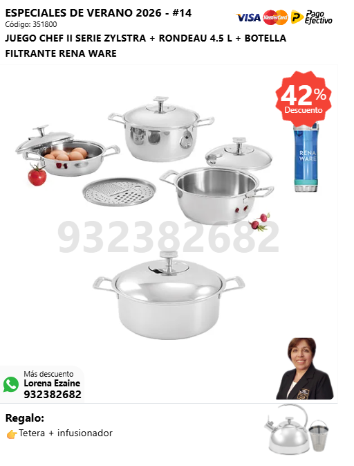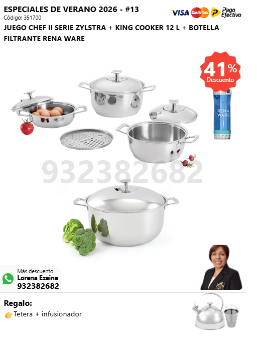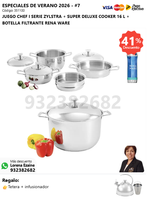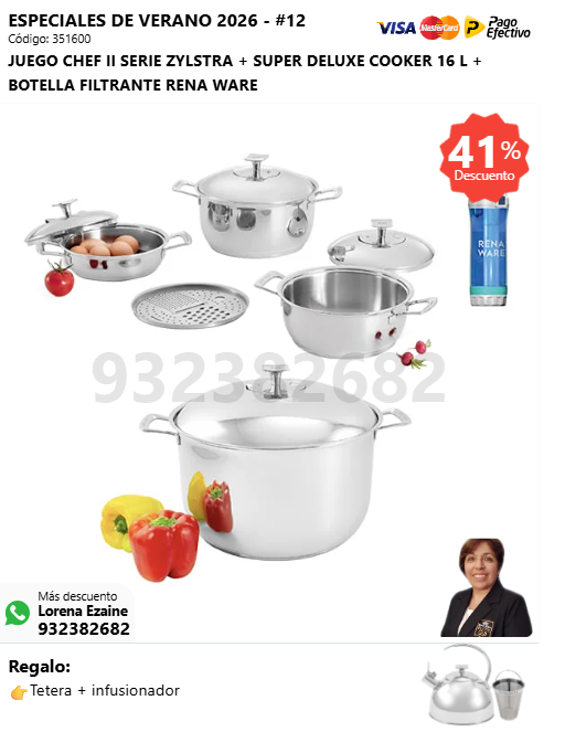 JUEGO CHEF II SERIE ZYLSTRA + SUPER DELUXE COOKER 16 L + BOTELLA FILTRANTE RENA WARE + (🎁: Tetera + infusionador )