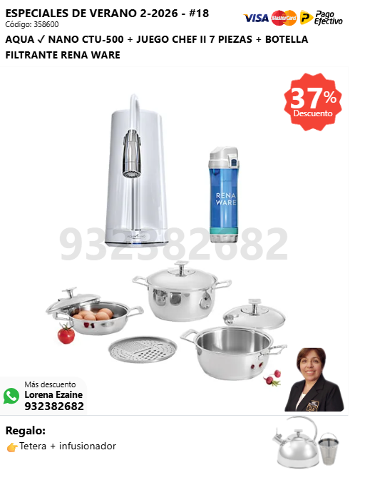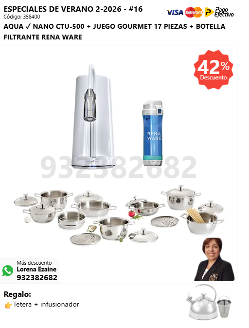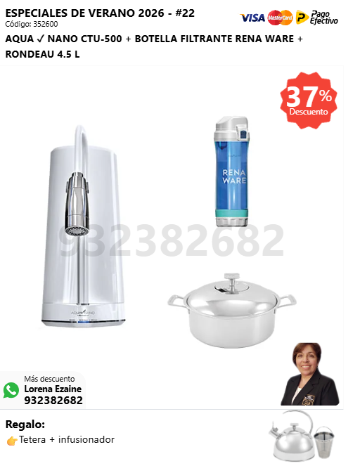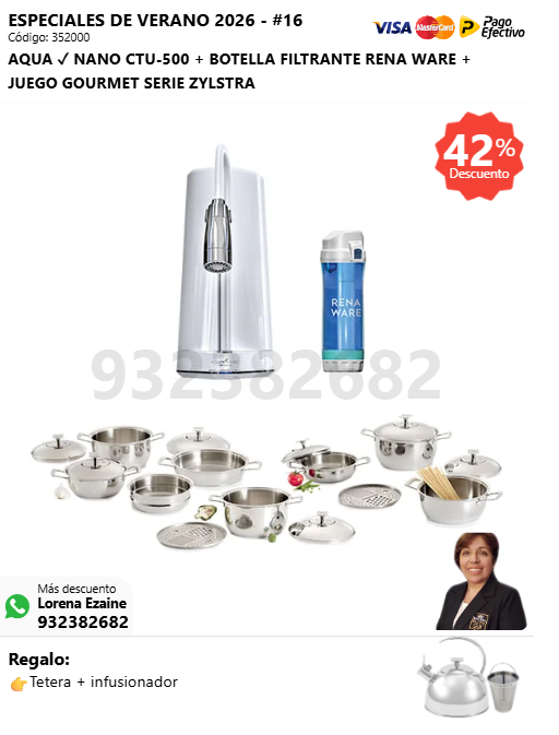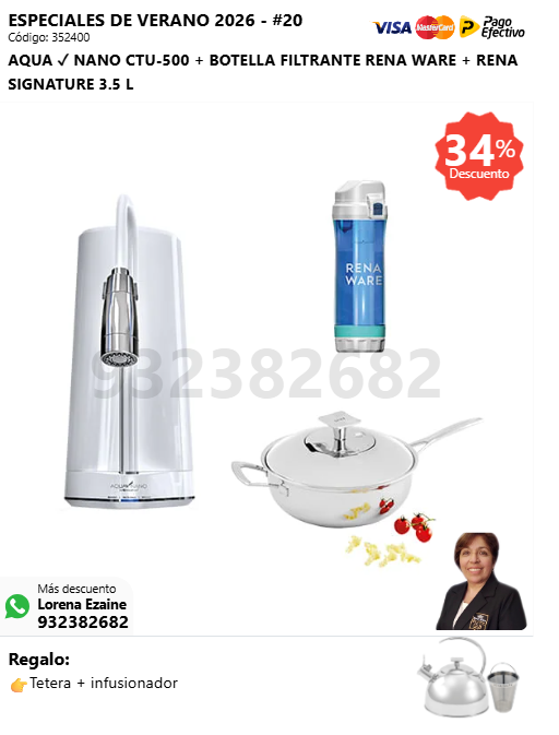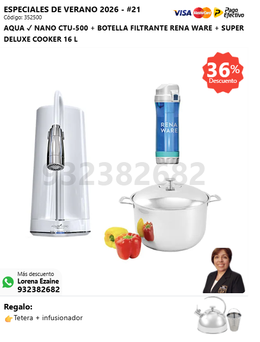 AQUA ✓ NANO CTU-500 + BOTELLA FILTRANTE RENA WARE + SUPER DELUXE COOKER 16 L + (🎁: Tetera + infusionador )