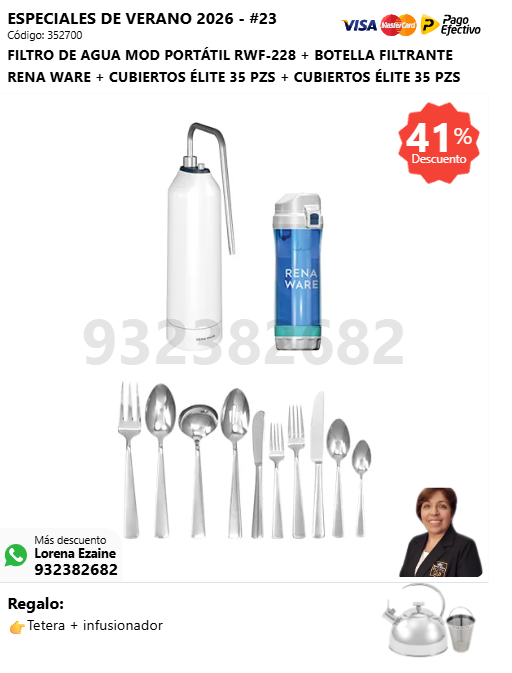FILTRO DE AGUA MOD PORTÁTIL RWF-228 + BOTELLA FILTRANTE RENA WARE + CUBIERTOS ÉLITE 35 PZS + CUBIERTOS ÉLITE 35 PZS + (🎁: Tetera + infusionador )