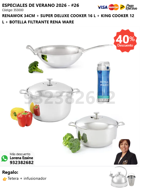 RENAWOK 34CM + SUPER DELUXE COOKER 16 L + KING COOKER 12 L + BOTELLA FILTRANTE RENA WARE + (🎁: Tetera + infusionador )