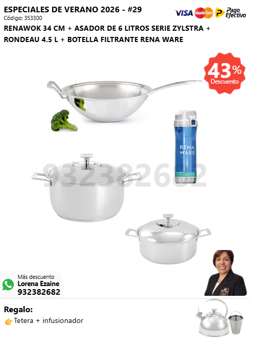 RENAWOK 34 CM + ASADOR DE 6 LITROS SERIE ZYLSTRA + RONDEAU 4.5 L + BOTELLA FILTRANTE RENA WARE + (🎁: Tetera + infusionador )