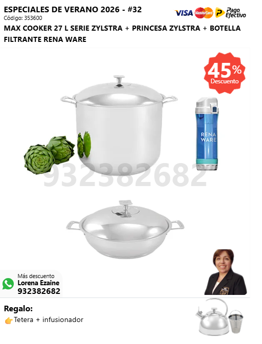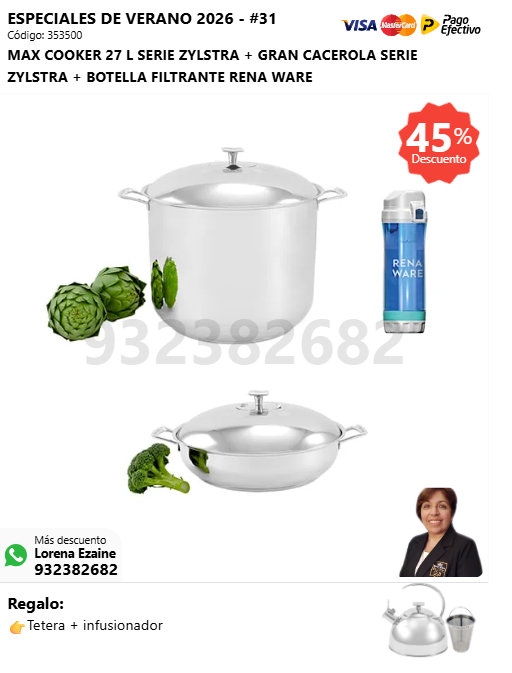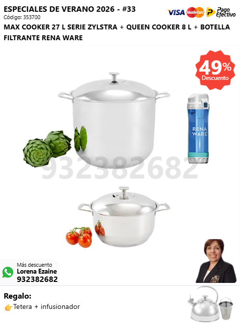 MAX COOKER 27 L SERIE ZYLSTRA + QUEEN COOKER 8 L + BOTELLA FILTRANTE RENA WARE + (🎁: Tetera + infusionador )