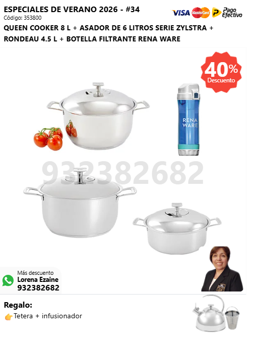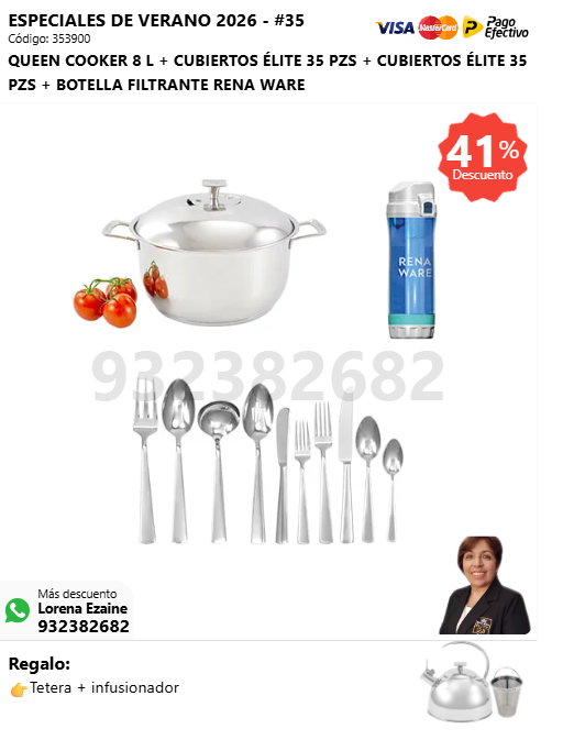 QUEEN COOKER 8 L + CUBIERTOS ÉLITE 35 PZS + CUBIERTOS ÉLITE 35 PZS + BOTELLA FILTRANTE RENA WARE + (🎁: Tetera + infusionador )