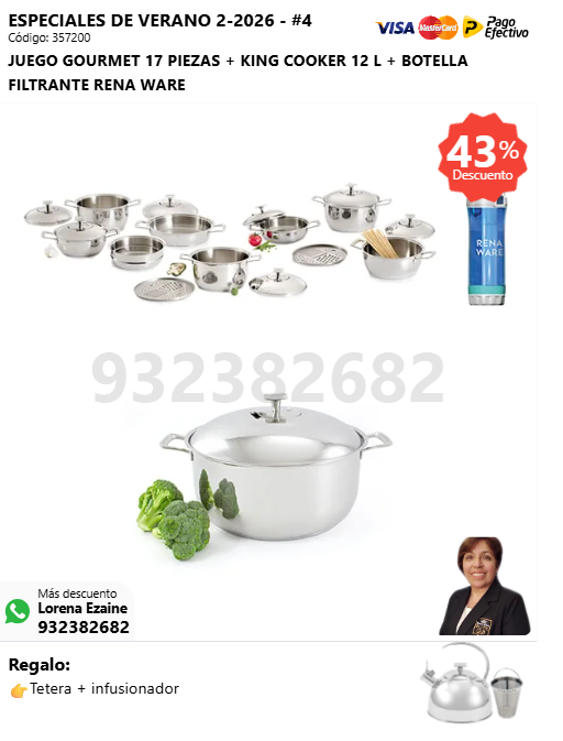 JUEGO GOURMET 17 PIEZAS + KING COOKER 12 L + BOTELLA FILTRANTE RENA WARE + (🎁: Tetera + infusor )
