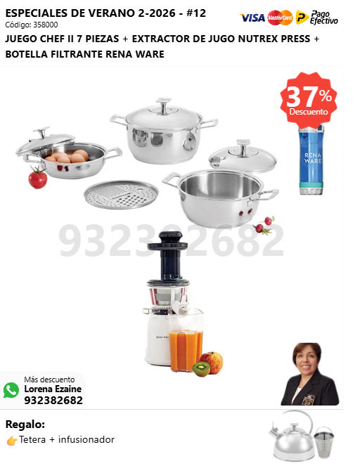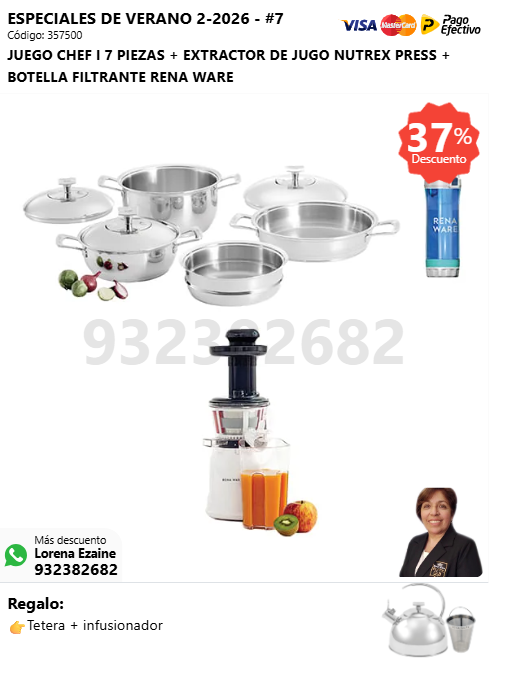JUEGO CHEF II 7 PIEZAS + EXTRACTOR DE JUGO NUTREX PRESS + BOTELLA FILTRANTE RENA WARE + (🎁: Tetera + infusor )