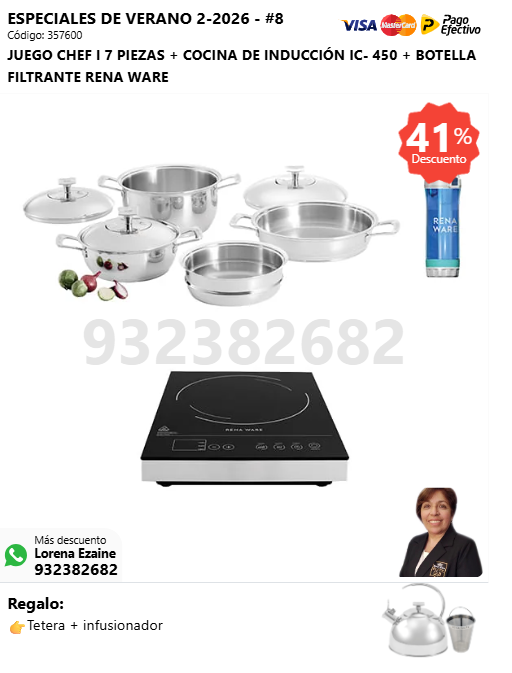 JUEGO CHEF I 7 PIEZAS + COCINA DE INDUCCIÓN IC- 450 + BOTELLA FILTRANTE RENA WARE + (🎁: Tetera + infusor )
