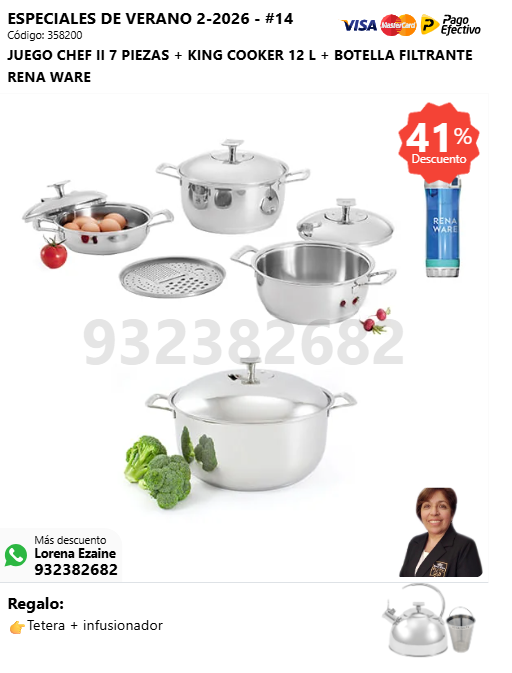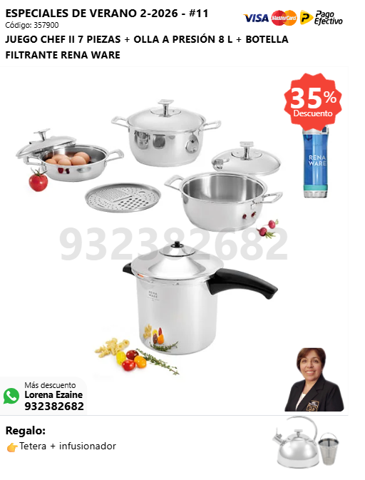 JUEGO CHEF II 7 PIEZAS + KING COOKER 12 L + BOTELLA FILTRANTE RENA WARE + (🎁: Tetera + infusor )