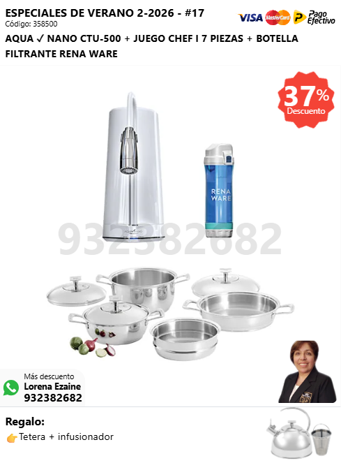 AQUA ✓ NANO CTU-500 + BOTELLA FILTRANTE RENA WARE + JUEGO CHEF II SERIE ZYLSTRA + (🎁: Tetera + infusionador )