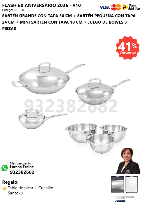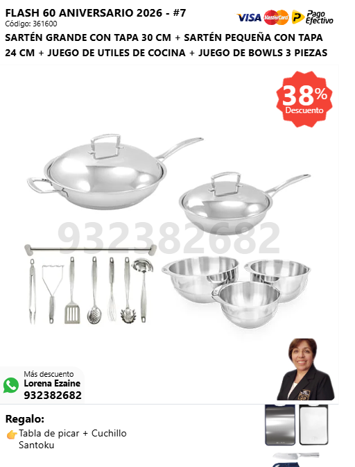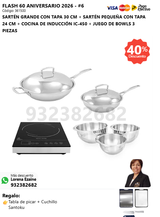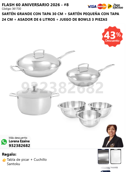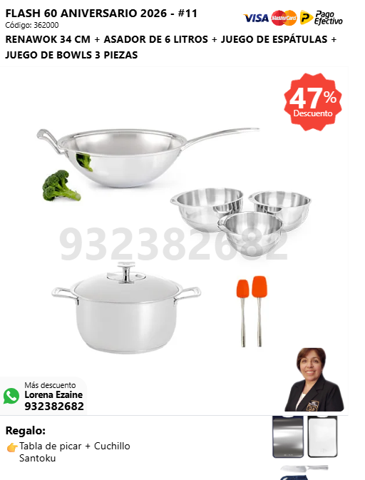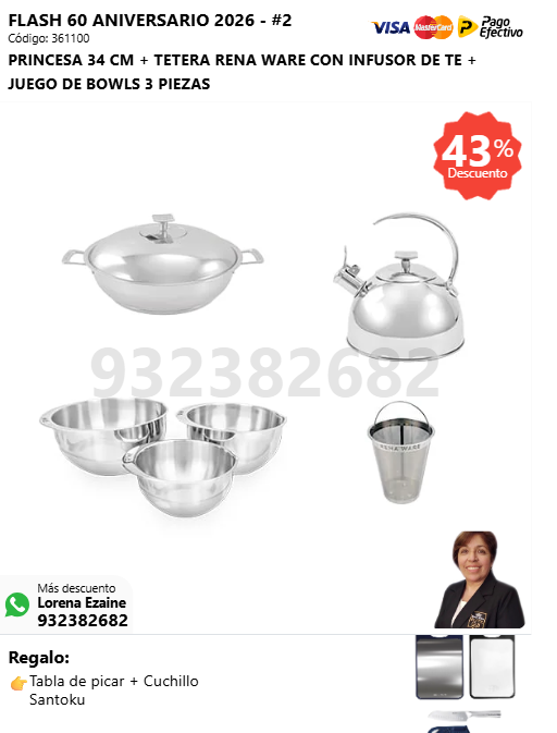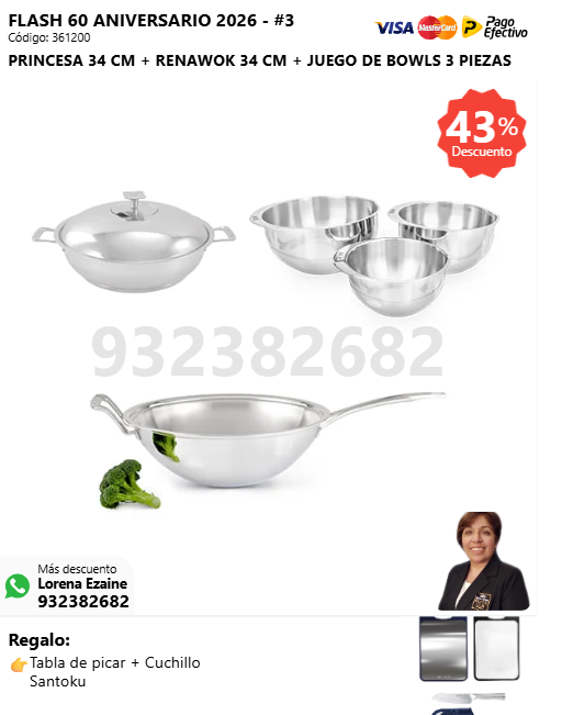 PRINCESA 34 CM + RENAWOK 34 CM + JUEGO DE BOWLS 3 PIEZAS + (🎁: Tabla de picar + Cuchillo Santoku )