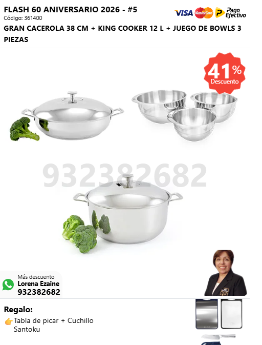 GRAN CACEROLA 38 CM + KING COOKER 12 L + JUEGO DE BOWLS 3 PIEZAS + (🎁: Tabla de picar + Cuchillo Santoku )