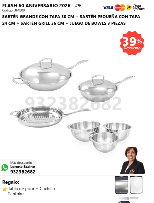 SARTÉN GRANDE CON TAPA 30 CM + SARTÉN PEQUEÑA CON TAPA 24 CM + SARTÉN GRILL 36 CM + JUEGO DE BOWLS 3 PIEZAS + (🎁: Tabla de picar + Cuchillo Santoku )