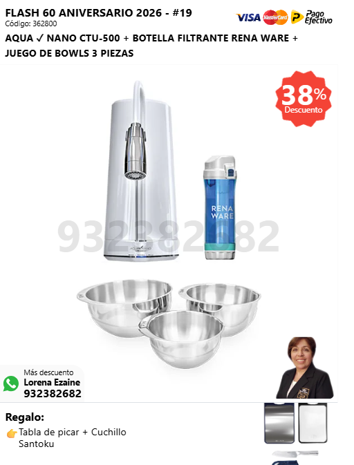 AQUA ✓ NANO CTU-500 + BOTELLA FILTRANTE RENA WARE + JUEGO DE BOWLS 3 PIEZAS + (🎁: Tabla de picar + Cuchillo Santoku )