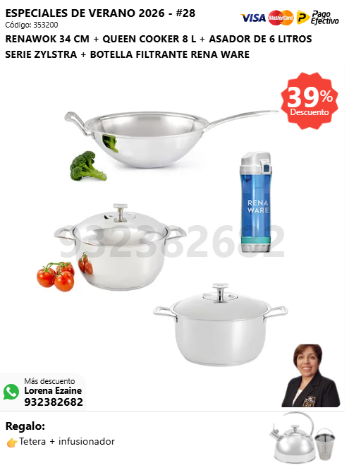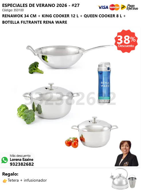 RENAWOK 34 CM + KING COOKER 12 L + QUEEN COOKER 8 L + BOTELLA FILTRANTE RENA WARE + (🎁: Tetera + infusionador )