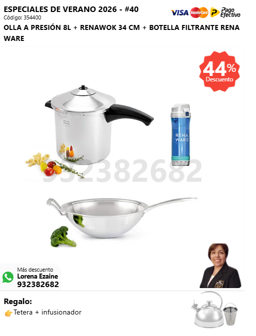 OLLA A PRESIÓN 8L + RENAWOK 34 CM + BOTELLA FILTRANTE RENA WARE + (🎁: Tetera + infusionador )