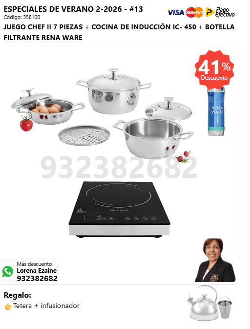 JUEGO CHEF II 7 PIEZAS + COCINA DE INDUCCIÓN IC- 450 + BOTELLA FILTRANTE RENA WARE + (🎁: Tetera + infusor )