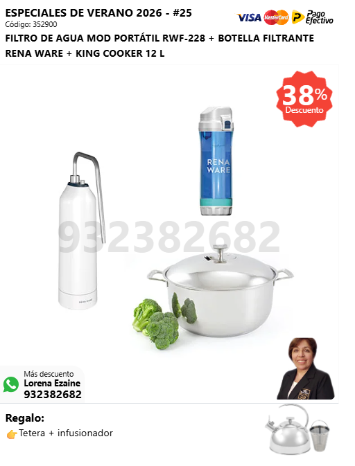 FILTRO DE AGUA MOD PORTÁTIL RWF-228 + BOTELLA FILTRANTE RENA WARE + KING COOKER 12 L + (🎁: Tetera + infusionador )