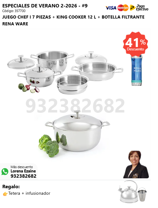 JUEGO CHEF I 7 PIEZAS + KING COOKER 12 L + BOTELLA FILTRANTE RENA WARE + (🎁: Tetera + infusor )