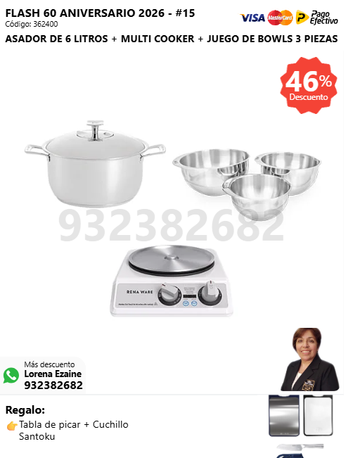 ASADOR DE 6 LITROS + MULTI COOKER + JUEGO DE BOWLS 3 PIEZAS + (🎁: Tabla de picar + Cuchillo Santoku )