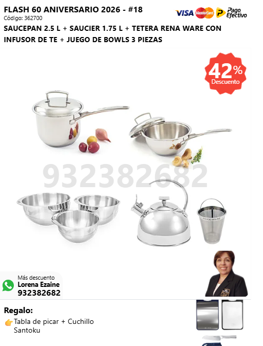 SAUCEPAN 2.5 L + SAUCIER 1.75 L + TETERA RENA WARE CON INFUSOR DE TE + JUEGO DE BOWLS 3 PIEZAS + (🎁: Tabla de picar + Cuchillo Santoku )