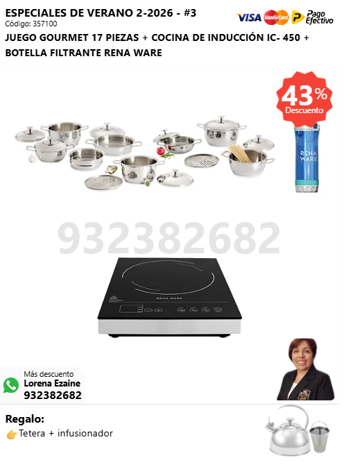 JUEGO GOURMET 17 PIEZAS + COCINA DE INDUCCIÓN IC- 450 + BOTELLA FILTRANTE RENA WARE + (🎁: Tetera + infusor )