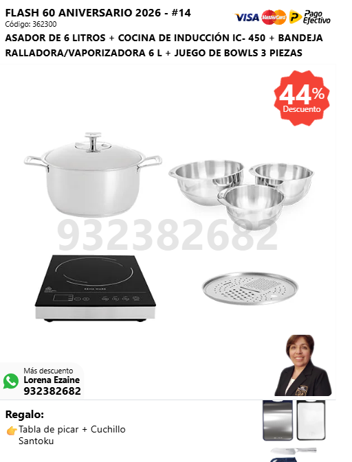 ASADOR DE 6 LITROS + COCINA DE INDUCCIÓN IC- 450 + BANDEJA RALLADORA/VAPORIZADORA 6 L + JUEGO DE BOWLS 3 PIEZAS + (🎁: Tabla de picar + Cuchillo Santoku )