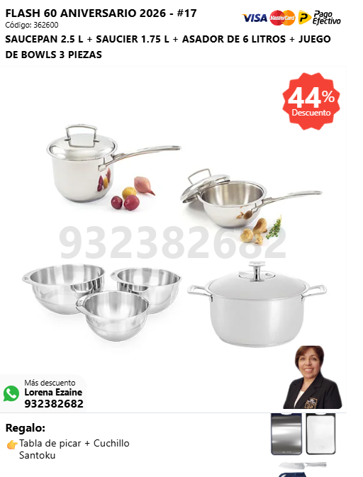 SAUCEPAN 2.5 L + SAUCIER 1.75 L + ASADOR DE 6 LITROS + JUEGO DE BOWLS 3 PIEZAS + (🎁: Tabla de picar + Cuchillo Santoku )