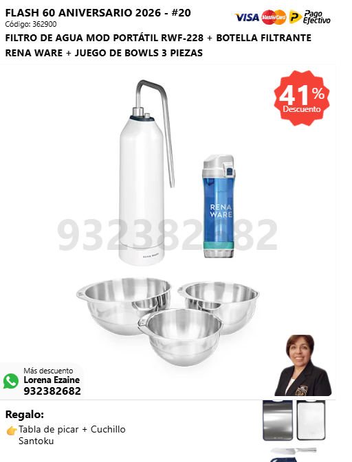 FILTRO DE AGUA MOD PORTÁTIL RWF-228 + BOTELLA FILTRANTE RENA WARE + JUEGO DE BOWLS 3 PIEZAS + (🎁: Tabla de picar + Cuchillo Santoku )