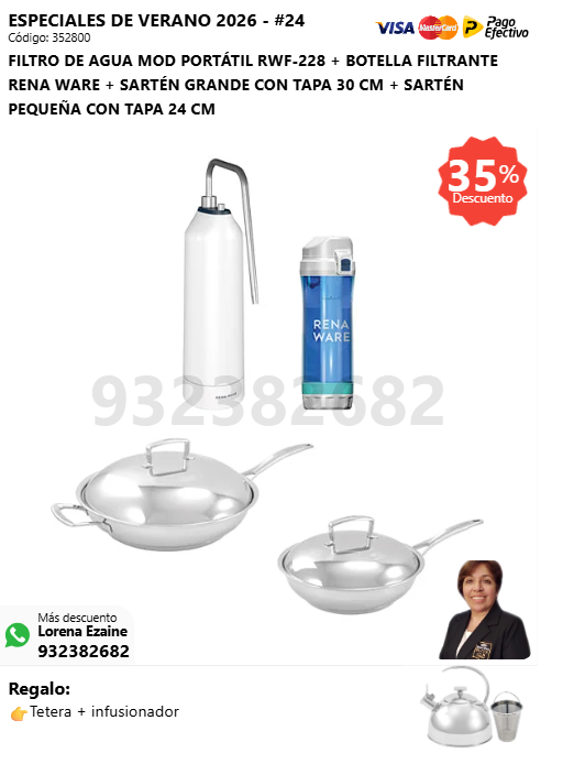 FILTRO DE AGUA MOD PORTÁTIL RWF-228 + BOTELLA FILTRANTE RENA WARE + SARTÉN GRANDE CON TAPA 30 CM + SARTÉN PEQUEÑA CON TAPA 24 CM + (🎁: Tetera + infusionador )